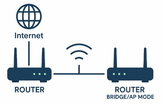 The extended wireless network uses a simple topology where the Root Router provides internet access, and the secondary router repeats this signal using WDS Bridging.
