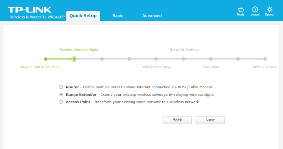 Under Quick Setup, the device was configured to operate in Range Extender (WDS Bridge) Mode.